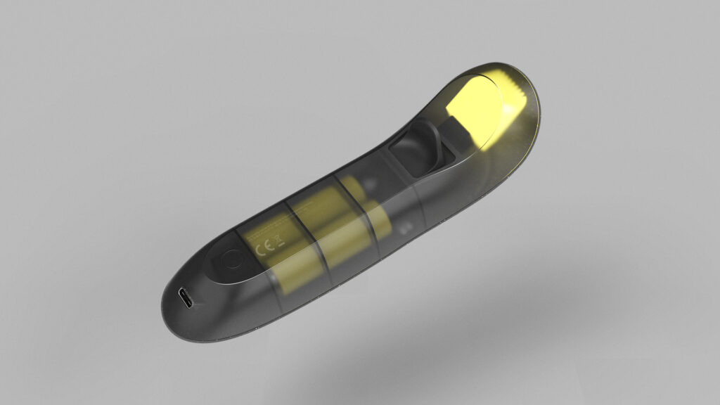 With the controller it is possible to control a bunch of parameters at once with only one hand. The software has a node-based interface, so it’s like connecting wires on a modular synthesizer for example the x-axis of the gyroscope controls to the value of a filter. The manipulation is visualized by a RGBW-LED on the frontside of the controller to what the artist does on stage.